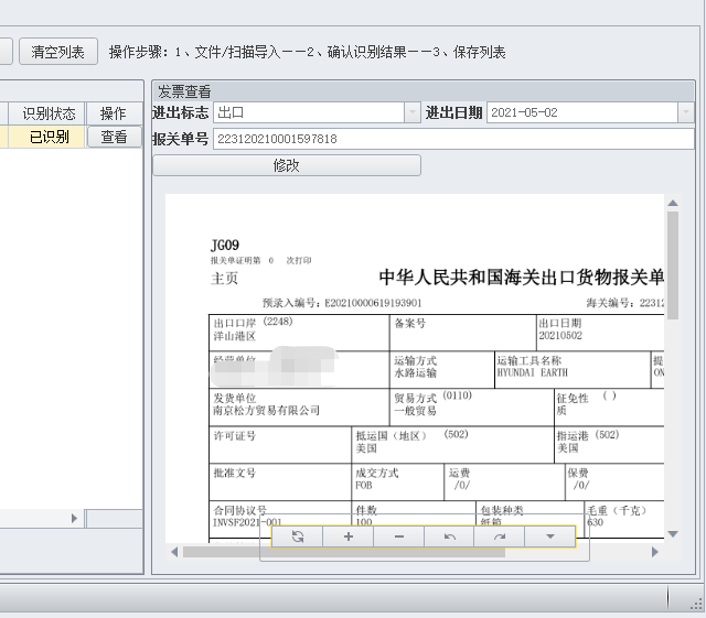 # **报关单影像采集** * 文件导入:如果已经有报关单的影像文件,可通过文件导入,选择影像文件所在的文件夹,进行导入; * 扫描导入:调用批量扫描仪获取影像文件,建议使用 ADF 馈纸型的批量扫描仪,不建议使用平板玻璃扫描仪 对于获取的报关单影像文件,系统会自动进行 OCR 识别系列操作,并在数据里表中显示。可通过识别状态,查看每张报关单影像文件的处理结果。 * 删除:删除列表中的影像文件,删除后,该影像文件若再次导入或扫描,会重新进行识别。 * 保存列表:保存当前列表中的影像数据和电子数据,保存后,影像数据和报关单数据可通过报关单管理模块和文件管理模块中查询。 * 导出结果:导出当前列表中的数据 * 清空列表:清空本列表数据,在当前列表中进行多次扫描时,列表中的数据会进行追加,对于文件导入时,重复选择相同文件,不会重复追加(系统会自动去重);  * 修改报关单识别要素 一些情况下,如果报关单的影像文件不清楚或报关单本身不清楚,均可能导致识别失败,从而无法自动获取该张报关单的信息要素;当出现此情况时,识别状态为未识别。此时,可以通过在影像查看界面中,点击“修改”按钮,手工修改进出标志、进出日期、报关单号,点击“保存”。  * 报关单预览 通过报关单预览,可查看到该张发票的影像文件内容,支持 pdf、jpg、png、bmp、jpeg 等格式,其余格式无法预览。发票预览中提供了自适应、左转、右转、放大、缩小、下载功能。  # 报关单管理 报关单影像管理用于查询已经归档的报关单电子数据及其对应的影像数据;<font color=red>同时也可通过此模块,按照报关单业务上传其相关的补充单据,如采购发票、外销发票、提单、外销合同、采购合同、箱单、舱单等。</font>  * 批量下载:对于选中的报关单业务数据,可以批量获取其对应的影像文件,保存时以报关单号码为目录,将其对应的影像文件保存在该目录中,对于影像文件的文件名为影像文件原始的文件名 + 时间戳(避免文件名重复)。 * 文件名和单据类型的修改:对于影像文件的文件名和单据类型,可在附件列表中修改。修改后,其他业务若也关联此影像文件,均会修改。 * 添加文件:对当前选中的发票,可补充上传影像文件,上传时,选择文件的类型,可通过扫描仪、高拍仪、本地文件进行影像文件的获取;可一次扫描多页文件,合并归档,如合同、订单等。多页扫描后提交,会保存为一个 PDF 文件。<font color=red>注意:由于高拍仪扫描的文件为横向,若采用本地 OCR 识别,保存时,需要将图片左转或右转,否则文字无法正确识别。</font>   * 删除文件:删除当前选中的影像文件,删除后,<font color=red>若该影像文件被其他业务表单使用,其他业务表单也会被删除。</font> * 解除关联:解除当前影像文件和业务数据的关联关系,解除关联后,影像文件不会被删除,也不会影响其他业务和该影像文件的关联关系,此时若需要删除该影像文件,可进入文件管理中,找到该影像文件,进行删除。
