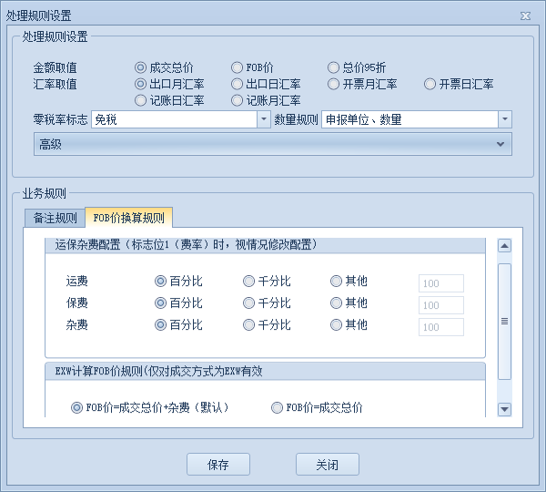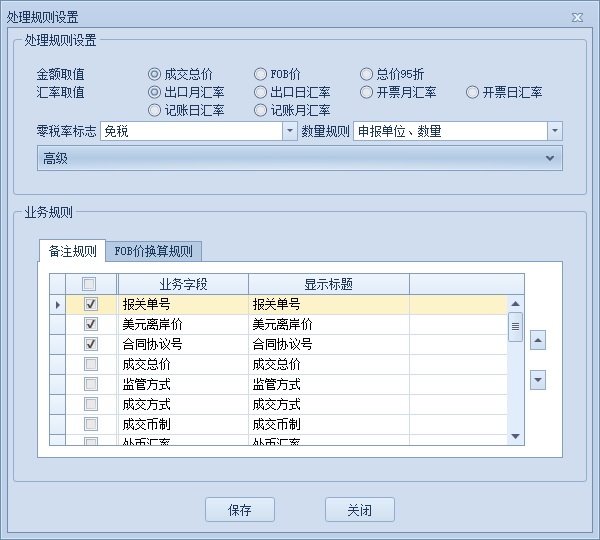 # 汇率设置 根据年月自动同步关单通及关单通专业版中所选年月的出口关单出口明细中所使用的币制及对应月、日汇率  ## 企业常用币制维护 用于企业自定义维护常用币制,币制维护后,自动同步汇率时,除根据企业业务数据自动同步出口商品的币制外,还会同步企业常用币制表中的汇率。 **注意:常用币制维护表中的币制删除后,不会删除已经同步到企业汇率表中的对应币制汇率** ==在进行外销发票业务处理时,系统会根据处理的报关单类型,自动取报关单商品明细中的币制进行汇率的自动同步,但如果运费、保费、杂费的币制并不会自动同步,所以如果运费、保费、杂费与商品明细币制不一致时,请务必在此功能中将币制手工设置在常用币制中(只需设置一次),设置后,系统以后每次同步月汇率,都会将常用币制的汇率进行同步。== # 商品代码维护 根据关单通、关单通专业版中的报关单中的商品代码,自动转换为国税退税使用的商品如8位代码、10位代码和11位代码;允许根据企业实际业务进行手工调整。  编码同步:获取关单通和关单通专业版中的商品代码,并自动转换为退税商品代码; 修改:对选中的商品代码进行手工修改映射的退税商品代码; 删除:删除选中的商品代码; 校验:对列表中的商品代码校验其在退税商品代码中的有效性;校验结果为绿色时,说明该当前日期商品代码在退税商品码库中有效期,红色标识无效,黄色表示未设置退税商品代码或该代码在退税码库中不存在; ==在进行导出开票模板时,系统会根据商品代码的属性,判断是否为视同内销的商品,并自动设置开票模板中该商品的征税率。== 征税率取值优先顺序为: 货物自编码设置(分类代码维护)>税务商品码库表(商品代码维护)>零税率标志(规则设置》 # 规则设置 修改、设置外销发票数据处理规则  ### 金额取值 成交总价:关单成交总价*汇率 FOB 价:(关单成交总价-运保佣费用)*汇率 成交总价 95 折:关单成交总价*汇率*0.95 ### 汇率取值 影响开票模板导出时金额计算。 出口日汇率:出口日期当天 出口月汇率:出口日期所在月 1 号 开票日汇率:开票日当天 开票月汇率:开票日所在月 1 号 记账日汇率:关单处理区的记账日期 注意:当且仅当汇率设置为记账日汇率时,关单处理区的记账日期字段才生效。 ### 零税率标志 影响导出外销发票 EXCEL 模板时零税率标志,可根据所在地国税局开具外销发票要求选择。 ### 票据自编码生成规则 按照系统时间自动生成:以 18 位报关单号为单位,自动根据导出时间生成票据自编码,重复导出票据自编码不同(默认) 按照报关单号 18 位生成:以 18 位报关单号作为票据自编码,重复导出票据自编码相同 按照报关单号 21 位生成: 以 21 位报关单号作为票据自编码,重复导出票据自编码相同 ### 限额拆分 开启后,关单处理取导出的模板中,若关单的总金额超出对应的发票限额,系统会自动根据发票限额对关单数据进行拆分 ### 备注设置  FOB 计算规则: 对于关单为成交总价,且运保佣标志为费率的,可自定义设置费率的比率  # 系统维护 ## 分类代码维护 ### 同步关单品名 可将关单通、关单通专业版中所有出口的商品代码及对应的品名同步至分类代码维护中,设置税收分类代码后,外销发票处理-报关单模块中导出的代开发票,会自动根据商品代码匹配税收分类代码