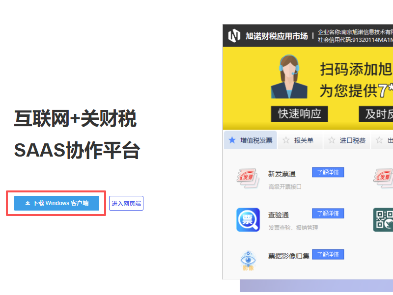 # 软件下载 访问旭诺官网([https://www.xunoi.com](https://www.xunoi.com)) 在首页,点击【下载Windows客户端】,下载软件安装包,(http://www.xunoi.com/uploads/soft/%E6%97%AD%E8%AF%BA%E8%B4%A2%E7%A8%8E%E5%BA%94%E7%94%A8%E5%B8%82%E5%9C%BA.zip)  # 软件安装 下载旭诺财税应用市场安装包程序,需解压,解压后双击程序运行图标,开始进行旭诺财税应用市场的安装。如图所示:  安装时必保持电脑可以连接互联网,且确认网络是否可以正常访问 [www.xunoi.com](http://www.xunoi.com) 网站,若无法正常访问该网站,系统会自动提示是否继续安装,如图所示:  安装程序会进入欢迎界面,如图所示:  用户可通过点击目标路径进行自定义软件安装路径,如图所示:   用户需认真查看许可协议,同意后方可进行下一步安装步骤,如图所示:  若目标机器中未安装framework4.0版本,系统会提示是否下载安装,如图所示:  点击确定后,安装程序自动启动下载程序,如图所示:  下载完成后,用户可根据引导安装framework4.0组件,如图所示:  组件安装结束后,系统会自动安装软件主程序,直至安装结束  结束后,桌面上会生成“旭诺财税应用市场”快捷方式,安装完成。  ==特别提醒:旭诺财税应用市场和旭诺其他相关产品不能安装在同一个目录,否则会因为版本不一致,导致部分模块使用时,产生报错!!==